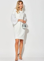 Нарядное, отрезное по линии талии платье с отлетным кружевным лифом (имитация комплекта, лиф платья соединен с юбкой атласной подкладкой) и юбкой из легкой гофрированной ткани с люрексом, расширяющейся к низу  (все ткани тянутся).  Втачной короткий рукав выполнен, как и лиф платья,  из кружева с напылением. Юбка платья с рельефами. Потайная застежка-молния  в боковом шве платья.  Лиф платья украшает брошь ручной работы. Великолепное  платье, в котором  Вы будете блистать на любом торжественном мероприятии!