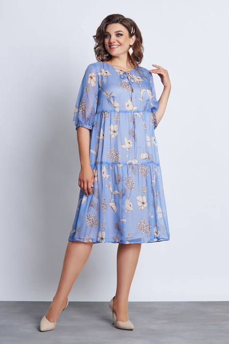 Нежное женское платье,  свободного покроя,  выполнено  из шифона, на подкладке. Горловина округлой формы окантованная основной тканью, по середине лифа подрез, также на лифе обработаны нагрудные вытачки. На полочке платья выполнено два подреза с небольшой сборкой. Спинка идентична полочке. Рукав втачной, со сборкой по низу рукава, обработан манжетой.