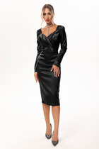 Стильное женское платье свободного силуэта, выполнено из джинса (тянется), в качестве отделки искусственная кожа (тянется). На полочке обработана фигурная кокетка из искусственной кожи, горловина округлой формы на обтачке. Рукав выполнен из искусственной кожи, по низу и окату присборен и обработан подкладкой. Спинка выполнена из джинса, со средним швом. В качестве дополнения — пояс из искусственной кожи. Стильное, современного кроя платье, выполнено из трендовых тканей подчеркнет ваш образ!