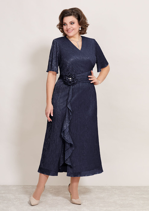Нарядное женское платье полу-прилегающего силуэта, выполнено из плиссированной ткани, на трикотажной подкладке. Горловина V-образной формы, на обтачке, лиф платья отрезной по линии талии, с втачным поясом из основной ткани, декорирован съемным цветком. Юбка А-образного силуэта, на юбке выполнен вертикальный подрез, с разрезом по низу и вставками воланов из основной ткани. Спинка со средним швом и вытачками, рукав втачной, оптимальной длины, выполнен из основной ткани. Эффектное платье из нежной и эффектной ткани прекрасно подойдет для любого мероприятия.