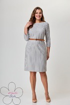Трикотажное платье без подкладки с V-образным вырезом горловины. По переду фигурный подрез с отлетной нижней частью. Спинка со средним швом и талиевыми вытачками. Рукав втачной одношовный с манжетой по низу. Длина платья 107 см, длина рукава 57 см.