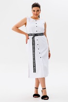 Платье женское полуприлегающего силуэта, отрезное по талии, отрезная присборенная рюша по низу изделия. Вдоль горловины притачная планка. Застежка по переду на петли-пуговицы. В области груди, частично по переду вдоль планки, обработаны рюшки. Рукав-реглан, по низу на резинке. Платье на подкладке, карманы в боковых швах.