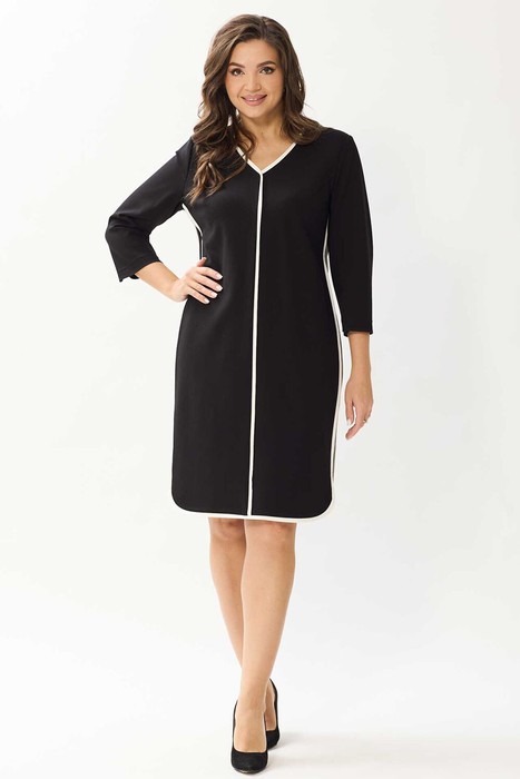 Платье женское, полуприлегающего силуэта. Перед с нагрудными вытачками и ццентральным швом. Спинка с талиевыми вытачками и отрезнгой кокеткой. Застежка на воздушную петлю и пуговицу. Низ фигурный. По боковым швам, горловине и среднему шву переда вставки с контрастным кантом.