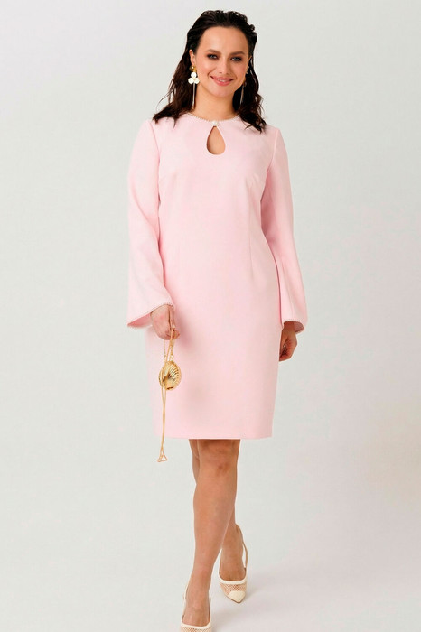 Элегантное платье-футляр, выполненное из плотной плательной ткани на подкладке.  Дизайн акцентирован декоративной бейкой с жемчужным оформлением на горловине и манжетах рукавов — технически точная обработка краев, обеспечивающая долговечность и эстетику. Центральная деталь — пуговица-застежка на горловине, формирующая изысканный вырез-капель с эффектом глубины.