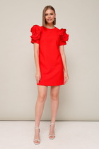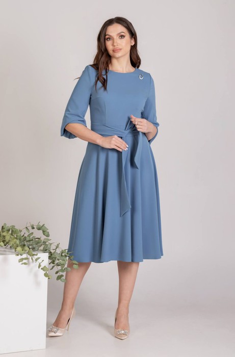Платье женское полуприлегающего силуэта отрезное по линии талии. Лиф переда с нагрудными и талиевыми вытачками. Горловина круглая. По среднему шву спинки сверху застёжка потайная молния. Юбка расклешённая. Рукав одношовный втачной. Низ рукава со складками. Изделие дополняет пояс кушак. Платье без подкладки. Украшением служит брошь.