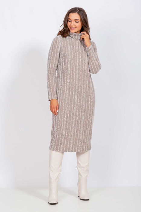 Платье женское полуприлегающего силуэта выполнено из трикотажного полотна. По переду нагрудные вытачки. Рукава одно шовные втачные. Карманы в боковых швах. Воротник стойка. Платье без подкладки.