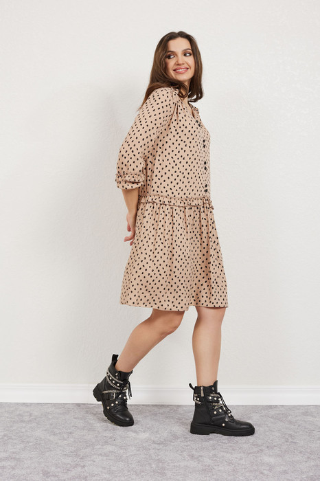 Платье женское свободного силуэта отрезное ниже линии талии, выполнено из плательной ткани. Перёд платья с фигурными кокетками и центральным швом. Спинка со средним швом и застёжкой на потайную молнию. Горловина V-образная. Рукава одно шовные втачные со сборкой по низу. Платье без подкладки. Украшением платья служат рюши и декоративные пуговицы.