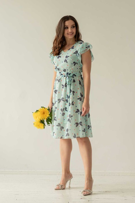 Платье женское полуприлегающего силуэта, отрезное по линии талии, выполнено из тонкой плательной ткани. Перёд с нагрудными вытачками. По спинке центральный шов и застёжка на воздушную петлю и пуговицу. Юбка, расклешённая к низу. Горловина V-образная. Рукава – двойные воланы. Платье дополняет пояс. Платье на тонкой трикотажной подкладке.