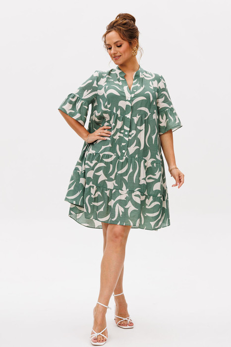 Платье свободного силуэта, выполненное из легкой струящейся ткани (не тянется). По верхней части переда – рельефный шов, переходящий в подрез со сборкой от линии подреза. Горловина с V-образным вырезом, отрезными планками и отделочными пуговицами, оформлена воротником-стойкой. По нижней части платья два ряда присборенных воланов. Рукава втачные, одношовные с отрезными присборенными воланами. Платье без подкладки.
