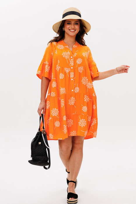 Платье свободного силуэта, выполненное из легкой струящейся ткани (не тянется). По верхней части переда – рельефный шов, переходящий в подрез со сборкой от линии подреза. Горловина с V-образным вырезом, отрезными планками и отделочными пуговицами, оформлена воротником-стойкой. По нижней части платья два ряда присборенных воланов. Рукава втачные, одношовные с отрезными присборенными воланами. Платье без подкладки.