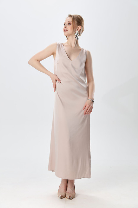 Платье прямого силуэта, с небольшим расширением к низу, длиной макси. Перед с нагрудной вытачкой из бокового шва. Вырез горловины переда и спинки имеют V-образную форму.