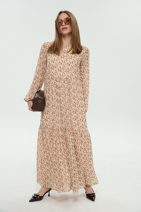 Платье макси прямого силуэта с округлым вырезом, отрезное по линии талии. Рукав немного приспущен, нижний край рукавов оформлен резинкой. По спинке вырез капелька с застёжкой на пуговицу. Изделие на подкладке. По низу юбки широкий волан.