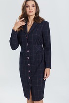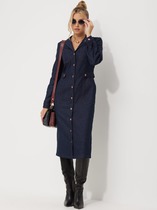 Эффектное двубортное платье длиной миди из облегчённого денима полуприлегающего силуэта. Линия плеча приспущена, рукав втачной три четверти с манжетой и патой. Горловина обработана обтачкой с  V-образным вырезом. Линия талии акцентирована притачным поясом. Имеются карманы в боковых швах. Изделие застёгивается на кнопки. Без подкладки.