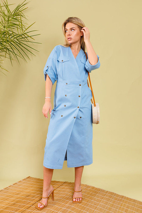Эффектное двубортное платье длиной миди из облегчённого денима полуприлегающего силуэта. Линия плеча приспущена, рукав втачной три четверти с манжетой и патой. Горловина обработана обтачкой с  V-образным вырезом. Линия талии акцентирована притачным поясом. Имеются карманы в боковых швах. Изделие застёгивается на кнопки. Без подкладки.