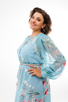 Лёгкое комбинированное платье, состоящее из лифа и юбки. Лиф прямого кроя с втачным рукавом с манжетой и патой на кнопки. Горловина обработана рубашечным воротником с отрезной стойкой. Застёжка центральная на кнопки. Юбка А-силуэта на подкладке.