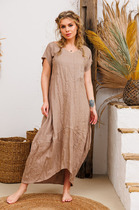 Воздушное платье в пол со спущеным рукавом, с V-образным вырезом горловины. Горловина обработана обтачкой. По краю горловины расположены 4 петли с продетой в них тесьмой из основной ткани. Платье с двумя ярусами. В нижней части платья в боковых швах разрезы от линии бедра до низа. Рукав одношовный, свободный, фигурный, со сборкой по окату. Низ рукава собран на резинку. В комплект к изделию идут нижнее платье-комбинация и пояс из основной ткани.