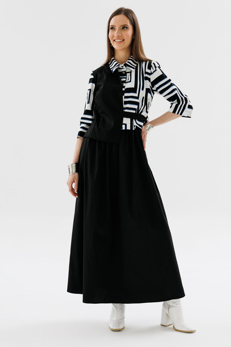 Эффектное комбинированное платье, состоящее из лифа со вставкой-имитацией жилета пиджачного типа по правой части переда. Лиф прямого кроя с втачным рукавом три четверти. Горловина обработана рубашечным воротником с отрезной стойкой. По линии талии собрано на резинку. Застёжка центральная на кнопки. Юбка А-силуэта