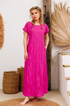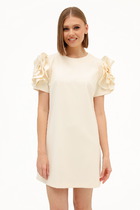 Платье длиной миди полуприлегающего силуэта отрезное по линии талии. Верхняя часть переда со средним швом и вытачкой , нагрудная вытачка объединена с талиевой вытачкой. Нижняя часть переда со средним швом и талиевыми вытачками. Вытачки верхней и нижней частей переда расположены на одной оси. Верхняя часть спинки со средним швом и талиевой вытачкой. Нижняя часть спинки со средним швом, талиевой вытачкой. Рукав втачной двухшовный. В шве по переднему перекату располагается разрез. Вырез горловины круглой формы, обработан обтачками. Застежка в среднем шве спинки на потайную тесьму-молнию. Платье декорировано тесьмой из пайеток.