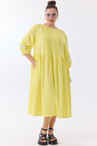 Платье состоит из двух платьев: нижнего и верхнего. Верхнее платье макси прямого свободного силуэта с воланом по низу изделия. Рукав втачной. Горловина обработана плосколежащим воротником. Центральная застёжка на петли и пуговицы. Нижнее платье комбинация на регулируемых бретелях.