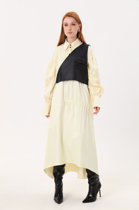 Платье прямого свободного кроя длиной миди, отрезное выше линии талии с двумя настрочными фигурными кулисами по переду и спинке. В кулисы вставлена шляпная резинка с фиксаторами по бокам. Воротник стояче-отложной рубашечного типа. Центральная застёжка на петли и пуговицы. Рукав втачной со сборкой по окату. Фигурная линия низа. В комплект входит деталь, имитирующая жилет. Фиксируется на декоративную тесьму и полукольца. Фурнитура может отличаться от фото.