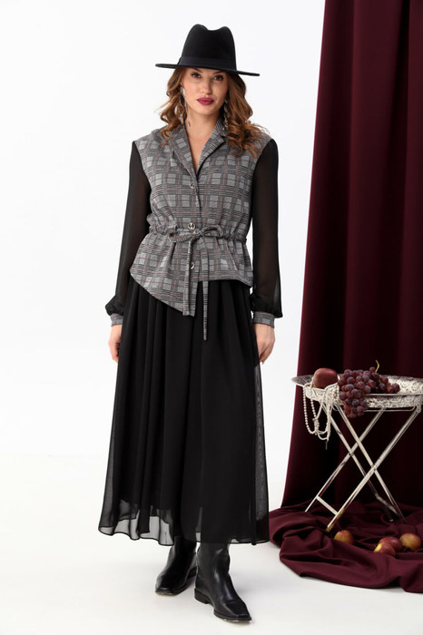 Платье комбинированное из двух тканей. Нижняя часть платья прямого силуэта, длинная , со сборкой по линии талии из отделочной ткани. Юбка на подкладке. Верхняя часть платья из основной ткани, частично на подкладке. Прямой силуэт, воротник пиджачного типа, рукав одношовный, втачной , с незначительно спущенной линией плеча, длинный, с притачной манжетой, декорированной разрезом. По линии ткани настрочная кулиса с завязками из основной ткани. Застежка центрально-бортовая на одну петлю и пуговицу функциональную и две пуговицы- имитация. Линия низа верхней части фигурная ассиметричная.
