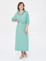 Платье макси с центральной отрезной застёжкой на потайную планку на петли и пуговицы.По переду и спинке цельнокроеные складки на уровне талии. Рукав втачной,одношовный рубашечноно типа. По низу рукава пробиты петли и вставлена завязка для фиксации сборки . Воротник рубашечный стояче отложной. В комплект к изделию идёт пояс из основной ткани для максимально комфортного регулирования объёма.