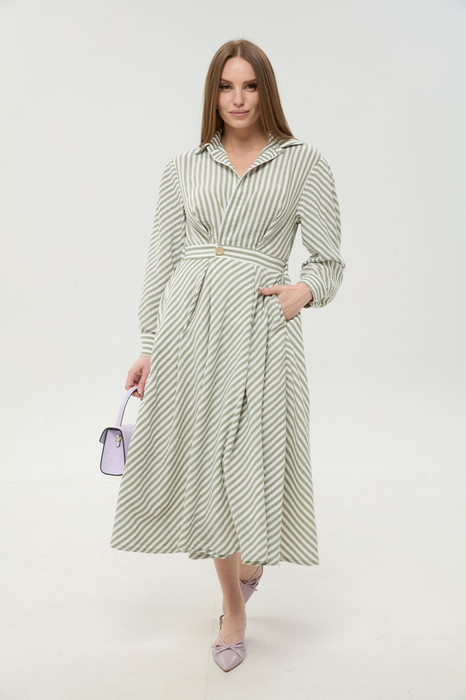 Платье полуприлегающего силуэта, отрезное по талии с объемной юбкой. Перед с глубоким запахом по талии, с защипами под грудью, с настрочной планкой. Спинка с плечевой кокеткой, складкой по центру и кулисой на талии с эластичной тесьмой. Юбка на спинке со сборкой по талии, на переде с глубокими складками. Рукав рубашечного кроя, с встречной складкой по окату и притачной манжетой с петлей и пуговицей. Воротник сорочечный с отрезной стойкой. Застежка на петли и пуговицы на притачном поясе переда. Изделие на подкладке.