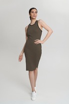 Платье длиной миди комбинированное, свободного кроя, расклешенное к низу. Перед состоит из центральной и боковой части. Спинка с притачной кокеткой, центральной и боковыми частями. На переде и спинке по линии талии настрочена кулиска, с регулировкой прилегания с помощью шнура. Рукав втачно одношовный короткий. Горловина изделия круглой формы.