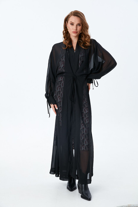 Платье состоит из двух платьев: верхнего и нижнего. Верхнее платье свободного кроя длиной макси с цельнокроеным рукавом и подрезом по линии талии. Перед со средним швом, переходящим в V-образный вырез горловину и разрез от середины бедра.  В верхней части переда выполнены рельефные швы до уровня подреза. Объем по линии талии регулируется завязками, закрепленными в рельефных швах переда.Средняя часть переда переходит в стойку. По низу рукавов складки и манжеты с завязками. Низ и разрез обработаны широкой подгибкой с закрытым срезом. Нижнее платье комбинация на регулируемых бретелях.