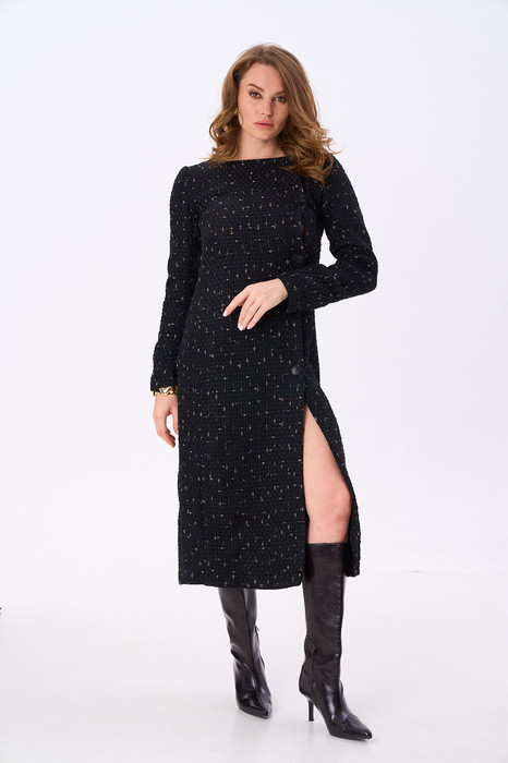 Платье длиной миди полуприлегающего силуэта.Застежка по переду бортовая, смещена в сторону левого бока, на  петли и пуговицы. Перед с рельефами из проймы, с нагрудной вытачкой и карманом. Нагрудная вытачка из рельефного шва. Спинка с плечевой вытачкой из плечевого шва и рельефами из проймы. В среднем шве спинки шлица. Рукав втачной, двухшовный. Вырез горловины переда имеет квадратную форму.