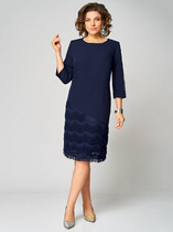 Платье женское прилегающего силуэта, выполнено из трикотажного полотна «велюр». Модель асимметричная, без подкладки, с плечевыми накладками. Перед платья состоит из двух частей перекрученных между собой по линии талии и скрепленных за запах. Перекрут деталей переда образует драпировку. На спинке расположены талиевые вытачки, в среднем шве – застежка на тесьму-«молнию» (50 см). Горловина округлой формы, углубленная спереди. Рукав длинный, втачной. Длина платья – 132 см, длина рукава – 57 см.