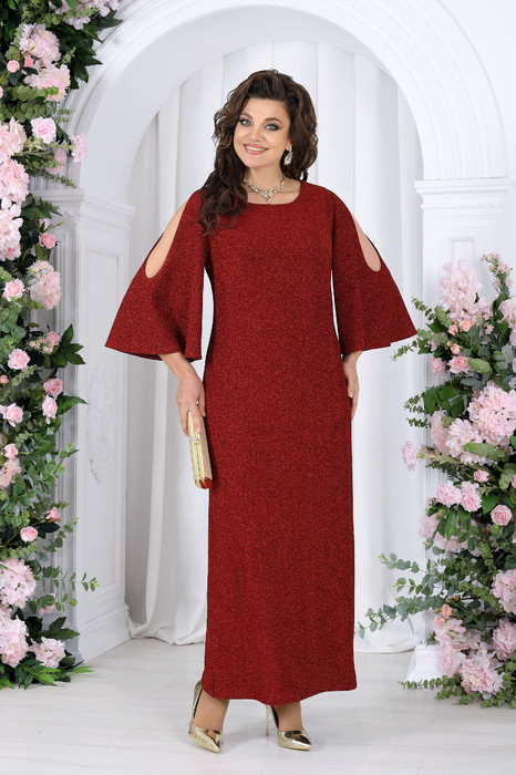 Платье женское полуприлегающего силуэта, выполнено из трикотажного полотна с фактурной лицевой стороной «люрекс». Модель на трикотажной подкладке, без застежки и плечевых накладок. Перед платья с нагрудными вытачками, направленными от проймы. Спинка с талиевыми вытачками и разрезом в нижней части среднего шва.  Края V-образной горловины спинки фиксируются тремя перемычками из основного материала; горловина переда круглой формы. Рукав трехчетвертной, расширенный, с вырезом «капля» от плеча. Длина платья -- 144 см; длина рукава - 49 см.