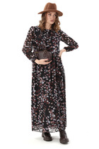 Платье женское полуприлегающего силуэта, выполнено из трикотажного полотна с фактурной лицевой стороной «люрекс». Модель на трикотажной подкладке, с плечевыми накладками. В левом боковом шве расположена застежка на потайную тесьму-«молнию» (35 см). Перед платья со смещенным к боковому шву рельефом, идущим от проймы до низа; в нижней части рельефа обработан разрез. Левая часть переда отрезная по линии талии, с односторонними горизонтальными складками, направленными от рельефа к центру. Спинка с талиевыми вытачками. Горловина спинки округлая, по переду V-образная, углубленная. Рукав короткий, втачной, формы «крылышко на запах», со скругленными срезами. Платье дополнено съемным «цветком» из основного полотна. Длина платья - 136 см; длина рукава - 34 см.