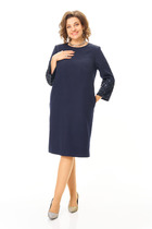 Платье женское полуприлегающего силуэта, выполнено из трикотажного полотна с фактурной лицевой стороной «люрекс». Модель на трикотажной подкладке, с плечевыми накладками. На правой части переда, вдоль отрезного пояса, заложены косые односторонние складки; детали лифа и юбки скреплены на запах. Низ платья асимметричный: правая часть переда -- удлинена к центру и оформлена углом, левая -- скругленная и входит в правый боковой шов. На спинке обработаны талиевые вытачки. В левом боковом шве предусмотрена застежка на потайную тесьму-«молнию» (35 см). Рукав длиной 3/4, втачной. Платье дополнено съемным «цветком» из основного полотна. Длина платья-138 см; длина рукава-41 см.
