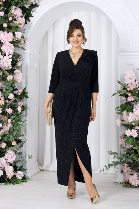 Платье женское полуприлегающего силуэта, выполнено из трикотажного полотна с фактурной лицевой стороной «люрекс». Модель на трикотажной подкладке, с плечевыми накладками. На правой части переда, вдоль отрезного пояса, заложены косые односторонние складки; детали лифа и юбки скреплены на запах. Низ платья асимметричный: правая часть переда -- удлинена к центру и оформлена углом, левая -- скругленная и входит в правый боковой шов. На спинке обработаны талиевые вытачки.  В левом боковом шве предусмотрена застежка на потайную тесьму-«молнию» (35 см). Рукав длиной 3/4, втачной. Платье дополнено съемным «цветком» из основного полотна. Длина платья-138 см; длина рукава-41 см.
