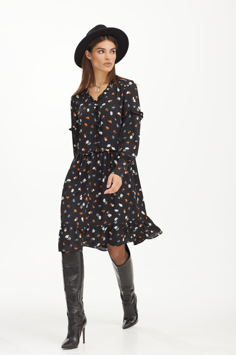Изящное модное платье из итальянского крепа. Модель свободной формы, по линии талии вставлена рюша из основной ткани, расширенное к низу. Платье отрезное чуть выше линии талии с двумя ярусами воланов.