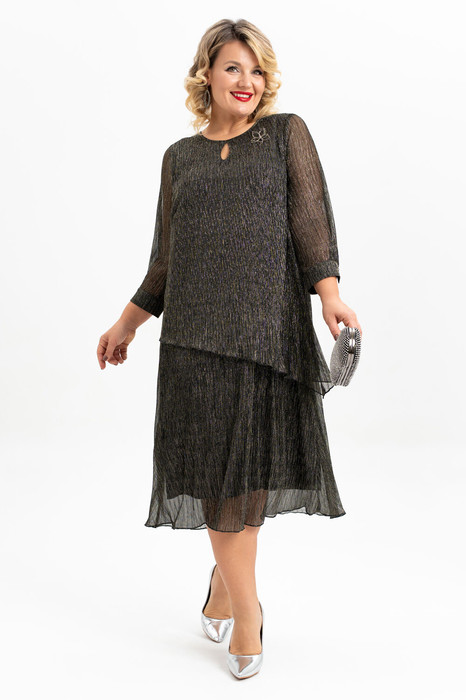 Это итальянское платье- имитация костюма  нарядного стиля больших размеров станет отличным выбором для тех, кто ценит элегантность и стиль. Платье сочетает в себе комфорт и долговечность. Ткань "плиссе" придает изделию оригинальную рельефную текстуру, которая делает его особенно привлекательным. Основная особенность этого платья — силуэт в виде трапеции, который подходит для разных типов фигур, а также каплевидный декор по горловине полочки. Длина юбки — миди. Платье предназначено для женщин плюс сайз и станет идеальным выбором для вечерних мероприятий, новогодних праздников, свадеб или юбилеев. Благодаря универсальному дизайну ее можно сочетать с различными нарядами. Это отличный подарок для жены, мамы, сестры или девушки. Платье украшено брошей-цветком которая добавляет элегантности и шарма, и ее можно заменить на другие аксессуары, адаптируя наряд под разные события и настроения. Легкая трикотажная подкладка делает его еще более комфортным, а рукава 3/4 и рубашечный манжет с застежкой на петлю и пуговицу  делают платье подходящим для большинства женщин. Выбирая это  платье  больших размеров  , Вы получаете не только стильное и элегантное платье, но и качественное удобное изделие, которое скрывает все неровности фигуры и  будет Вашим верным спутником на любых праздниках .