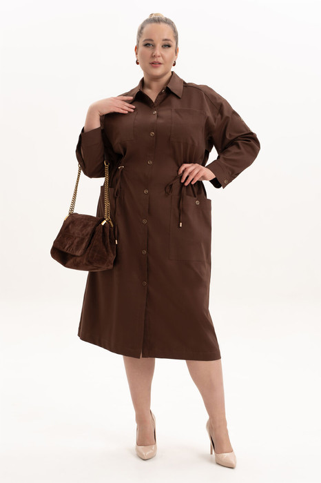 Платье офисное повседневное представляет собой идеальный выбор для женщин ищущих комфорт и стиль в ежедневной одежде. Это платье-плащ с застёжкой на петли и пуговицы, поясом на  кулисе, добавляющими удобство в носке и возможность адаптации к различным фигурам. Благодаря универсальности, наряд можно носить и на работу, в офис, на прогулку и в ресторан. По спинке имеется средний шов, шлица и отлитная кокетка в верхней части спинки. Особенностью этой модели является декоративная кокетка , напоминающая плащ. Длинные рукава с манжетами и патами на петли и пуговицы, что позволяет регулировать длину рукава, гармонично дополняют классический фасон платья  с воротником рубашечного типа. Большие накладные карманы и маленькие нагрудные по переду платья добавляют удобства в носке.Свободный оверсайз силуэт делает это платье универсальным.  Такое платье призвано подчеркнуть природную женскую красоту и грацию, а также безупречный вкус его обладательницы.