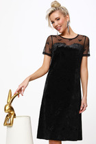 Нарядное платье выполнено из легкого полупрозрачного шифона с крэш-эффектом с небольшим добавлением люрексовой нити. Платье отрезное по линии талии со сборкой на резину по шву притачивания. Верх платья по переду и спинке целый. Рукав-реглан свободный короткий. Длина рукава от горловины в 48 р-ре – 36 см. в 64 р-ре – 42 см., ширина рукава по низу в 48 р-ре – 40 см. в 64 р-ре – 48 см. Овальный вырез горловины переда со сборкой. По спинке оригинальный V-образный вырез. Юбка прямая, целая по переду и спинке. Платье на подкладе, без застежек. Длина изделия от плеча в 48 р-ре 107 см. в 64 р-ре – 119 см.