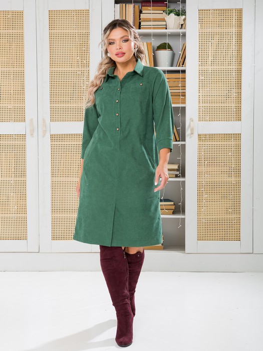 Удобное повседневное платье, полуприлегающего силуэта, выполнено из эластичного вельвета. Платье по переду с притачными кокетками, средним швом и шлицей длиной 22 см. В верхней части переда, по среднему шву, втачная планка с застежкой на петли и пуговицы. Платье с двумя накладными нагрудными карманами и удобными прорезными карманами с листочкой. Спинка со средним швом и двумя вертикальными вытачками. Горловина переда и спинки с втачным отложным воротником на цельнокроеной стойке. Рукав втачной свободный длиной 3/4 с притачными манжетами по низу. Манжеты застегиваются на петли и пуговицы. Длина рукава от плеча в 50 р-ре – 45 см. в 64 р-ре – 50 см., ширина рукава по низу в 50 р-ре – 27 см. в 64 р-ре – 33 см. Платье без подклада. Длина изделия по спинке в 50 р-ре – 102 см. в 64 р-ре – 110 см.