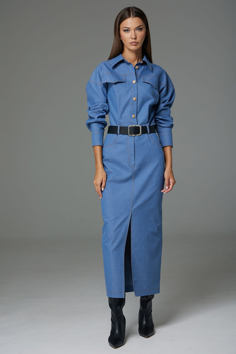 Платье выполнено из джинсовой ткани, полуприлегающего силуэта, покроя спущенное плечо, длинной за колено, зауженное к низу. Рукав длинный двушовный с манжетой по низу. Данное платье создает эффект блузы заправленной в юбку по талии. По переду и на спинке расположена горизонтальная кокетка, по спинке средний шов. По переду в шов притачивания кокетки вставлены клапаны. Горловина оформлена стояче-отложным воротником с отрезной стойкой. В верхней части переда расположена застежка-планка на пуговицы. В области талии по спинке и по переду расположен пояс-кокетка со шлевками. Нижняя часть платья оформлена как юбка – с разрезом по переду, с закругленными джинсовыми карманами в области бедер и застежкой на гульфик.
