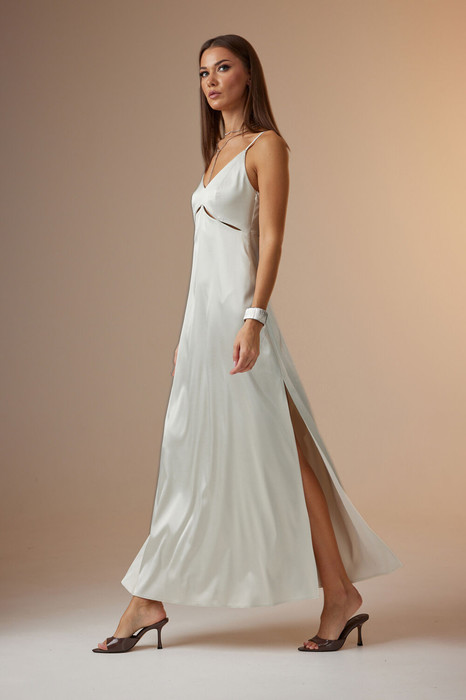 Платье женское, полуприлегающего силуэта, расширенное к низу, длинное с высоким разрезом в левом боковом шве. Платье отрезное под грудью, соединено с верхней частью частично по боковым швам и точечно по центру переда. Верхние части переда и спинки имеют рельефные линии. Платье с У-образным вырезом на брителях с регуляторами длины. В левый боковой шов вставлена потайная молния. Платье выполнено из атласной ткани.