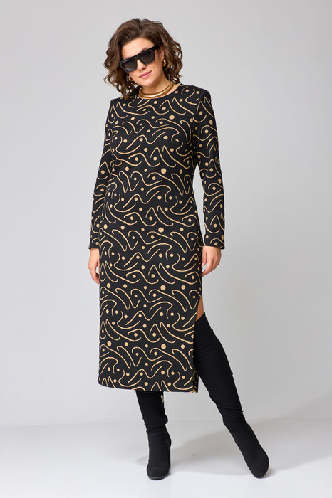 Платье женское, полуприлегающего силуэта, втачного покроя. Выполнено из трикотажного полотна. Спинка со средним швом, в котором расположена тесьма-молния и талиевые вытачки. Рукава полной длины, одношовные. По переду расположены нагрудные вытачки. Горловина округлой формы. В левом боком шве переда расположен разрез.
