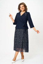 Платье полуприлегающего силуэта, втачного покроя. Выполнено из трикотажного плательного полотна с блеском. Отрезное по линии талии по переду, верхняя часть переда на подкладке. Рукав одношовный короткий. Верхняя часть переда состоит из кокетки и лифа со складками, идущими на «запах» (имитация застежки). Спинка с талиевыми вытачками и средним швом, в котором разрез и застежка на «тесьму-молнию». Платье к низу заужено, горловина «V-образной» формы по переду. Дополнением служит пояс с пряжкой из основной ткани.