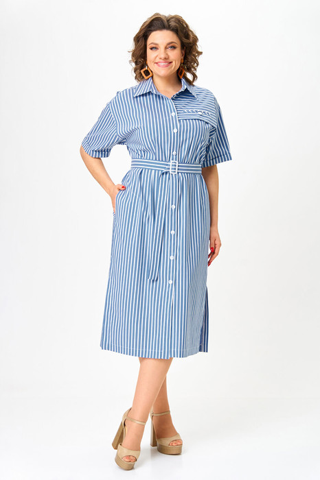 Платье женское прямого силуэта, покроя спущенное плечо, свободной формы оверсайз. Горловина оформлена стояче отложным воротником с отрезной стойкой. Центрально-бортовая застежка на петли-пуговицы. На правой части переда расположена отлетная кокетка с прорезной имитацией кармана с обтачками и петелькой. В боковых швах расположены карманы и разрезы. Спинка состоит из кокетки и нижней части, в которой расположена встречная складка. Рукав короткий одношовный, по низу обработан манжетой.
