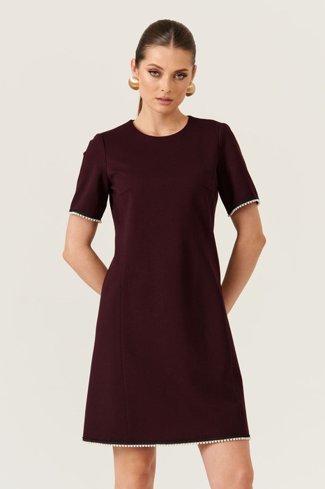 Особое внимание привлекает декоративная тесьма с контрастным жемчугом, которая украшает низ рукавов и подол платья, делая его особенно стильным и модным. Такое решение добавляет изысканности и подчеркивает нарядный характер изделия. Платье идеально подходит для коктейльных вечеринок, новогодних праздников или корпоративных мероприятий. Однако его базовый дизайн и универсальность позволяют использовать его и в повседневной жизни для офисных или деловых встреч.