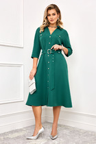Детали: полуприлегающий силуэт, рельефы переда и спинки, талиевые вытачки, пиджачный воротник, застежка на петли и пуговицы, втачные длинные рукава с разрезами и застежкой на потайную молнию, функциональные карманы с клапанами, платье на подкладке.