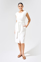 Детали: полуприлегающий силуэт, перед с функциональными карманами, однобортная застежка на петли и пуговицы, фигурный низ, рукава втачные с разрезами по низу, платье на подкладке.