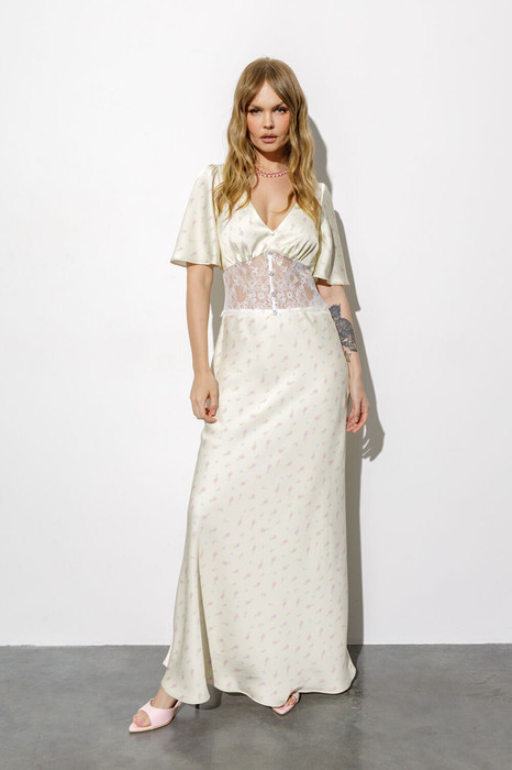 Детали: прилегающий силуэт, глубокий V-образный вырез, завышенная фигурная линия талии, лиф со сборкой, потайная молния в боковом шве, короткие рукава со сборкой по окату, лиф и юбка платья на подкладке 100% вискоза, декоративные пуговицы по переду.