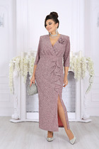 Модель с фигурным подрезом ниже линии талии. В верхней части переда застёжка на пуговицы. Нижняя часть платья со сборкой. В боковых швах высокие разрезы. По низу рукава отложная манжета с петлёй и пуговицей.